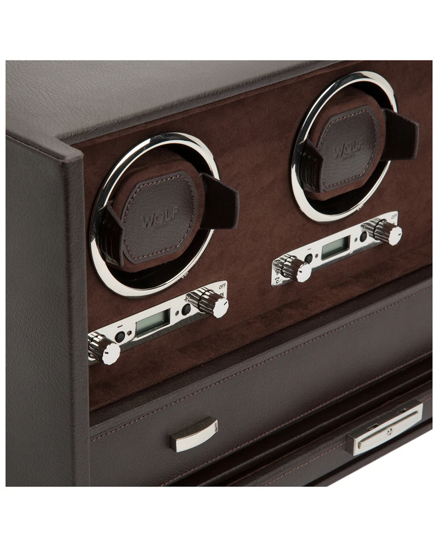 - Design details: handcrafted, chrome finished hardware, space saving rotating pocket door that is cleverly engineered to slide under the base of the winder and openly display the beauty of the timepiece, held securely in place with the WOLF patented lock-in cuff, additional space for three watches and accessories can be found inside an inconspicuous pull-out drawer