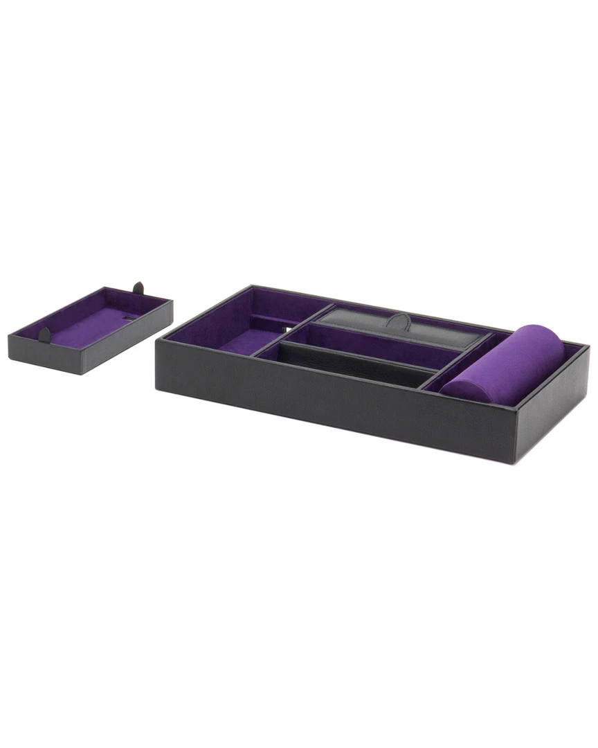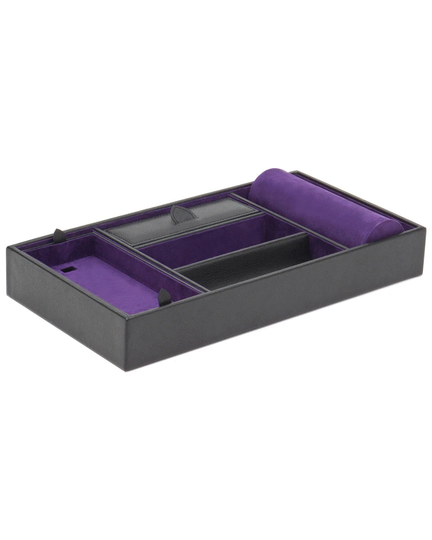- Design details: Stylish and classic, Blake is brought to life with top grain leathers, chrome and bold accents. This sleek black leather valet tray effortlessly organizes your electronics, money, jewelry, keys, watches and more. Includes purple Ultrasuede lining, 5 storage compartments, and a watch cuff that is interchangeable with the Blake Watch Roll, making it easier to travel with your timepieces; Storage: 5 storage compartments (1 with lid), 1 interchangeable long watch cuff, 1 removable tray with outlet for USB cord