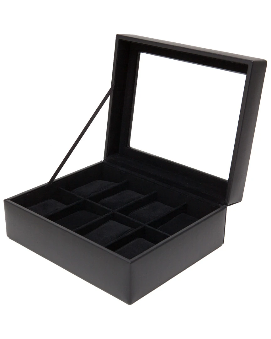 - Design details: This black watch storage box holds up to eight watches. It has a sturdy see-through tempered glass lid and, with 1.5″ (55mm) between each cuff, this compact yet spacious case can accommodate any size watch even the largest 52mm case!;