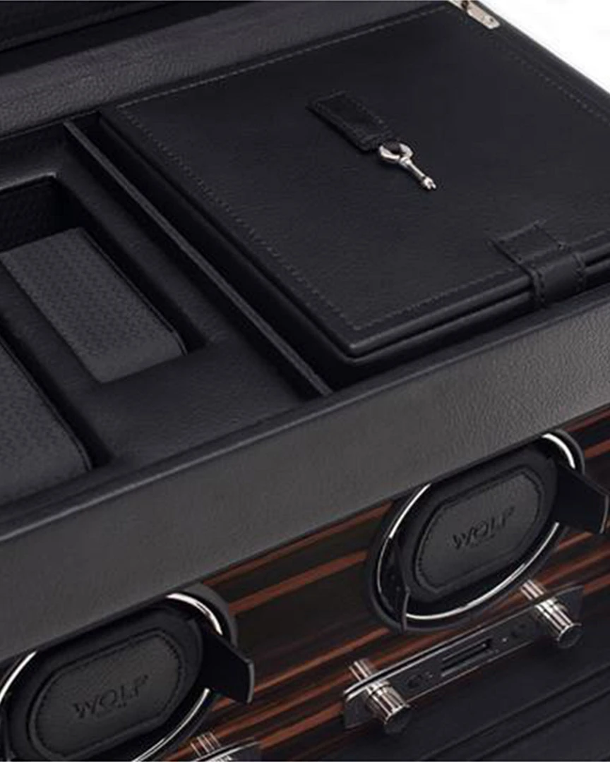 - Design details: Aged wood dashboards, chrome spoked wheels, leather that is glove soft. Roadster – inspired by the best of British motorcars, Jaguar, Aston Martin, Bristol and the like. Turning your watch perfectly to a precise number of turns, the Roadster double winder with storages ebony macassar polished wood, chrome finished hardware and 3-piece watch storage makes the perfect backdrop for your watch. ; Patented Innovation – Every WOLF winder counts the precise number of rotations. All other winder estimate the number of rotations.