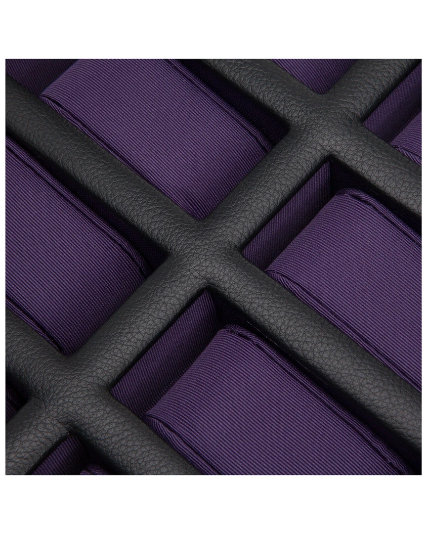 - Design details: Retro shapes and colors make Windsor a perfect companion for your timepieces. Display and organize your collection beautifully with the Windsor 10-piece watch box. Features chrome finished hardware, locking glass cover, smooth black vegan leather, purple textured silk lining and 10-piece watch storage; Storage: 10 piece watch storage (cuff will accommodate up to 52mm case)
